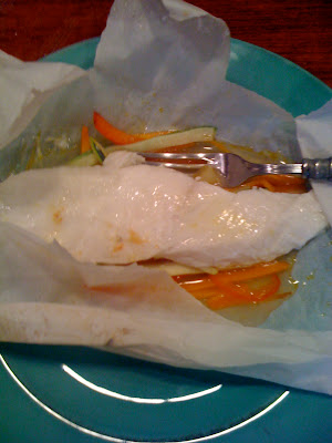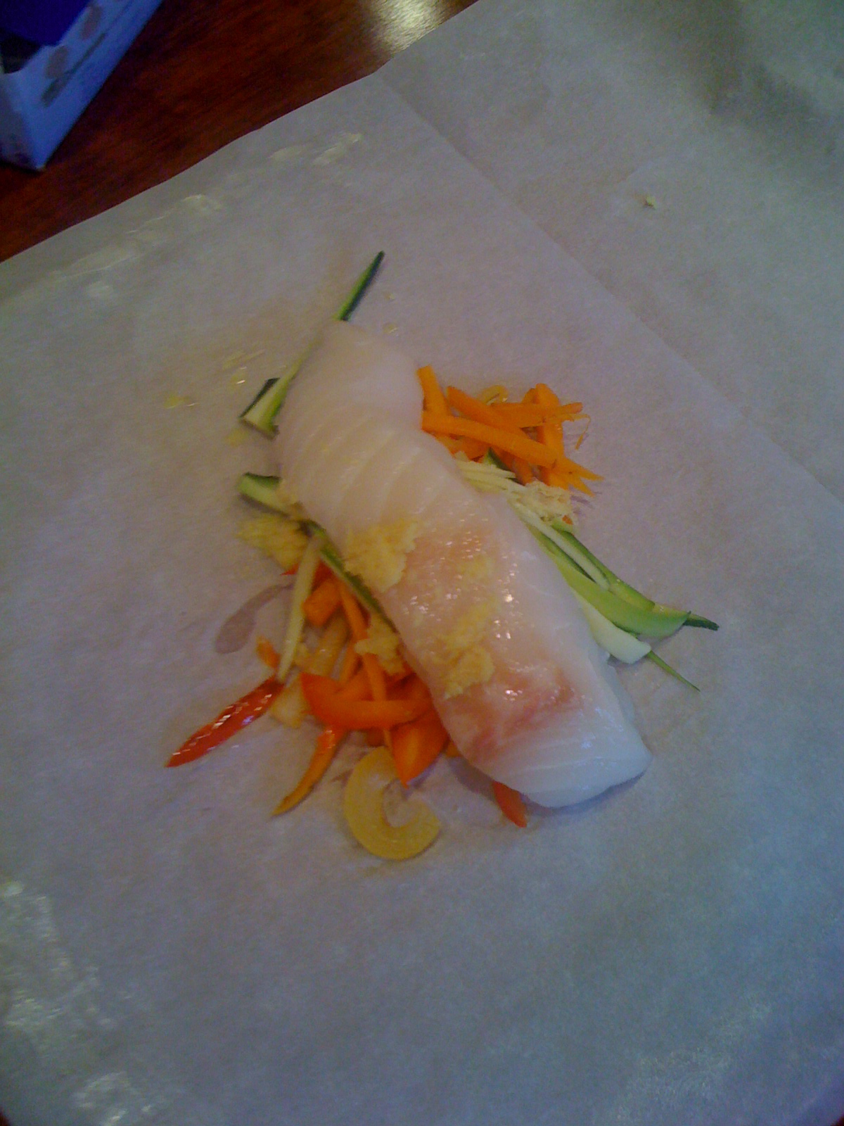 Tear off a large piece of parchment paper and fold it in half. Add a serving of vegetables including the raw, julienned zucchini to one side of parchment close to the fold. Dollop 1/2 t. butter on top with s&p to taste (this is not the Standard & Poors). Layer on a serving a of fish and another 1/2 t. of butter and s&p. I added grated ginger (Bowling for Taste) to the top. Yum.