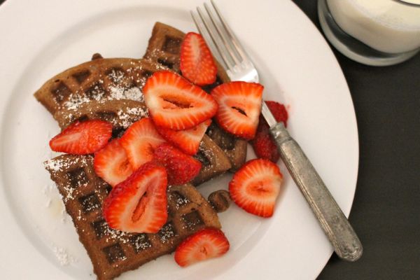 I found this low-sugar, high flavorchocolate waffle recipe. Cocoa enriches the flavor while a 50/50 balance of white and wheat flours limits refined starches. No need for syrup with a light, and I mean light, dusting of powdered sugar and a slippery cascade of sliced strawberries.
